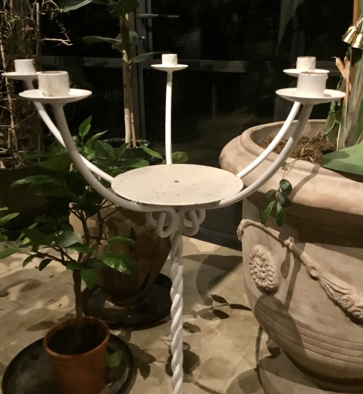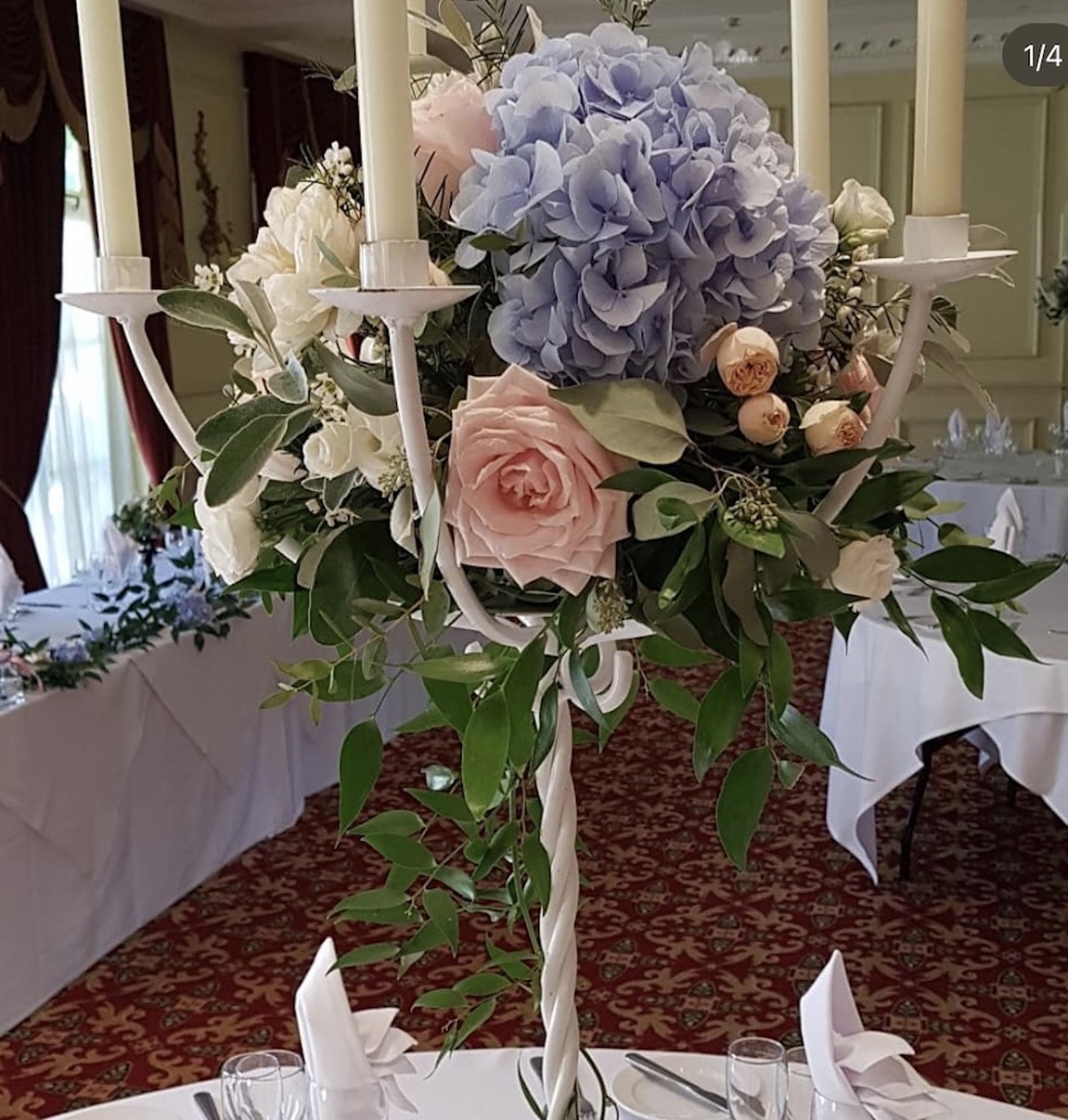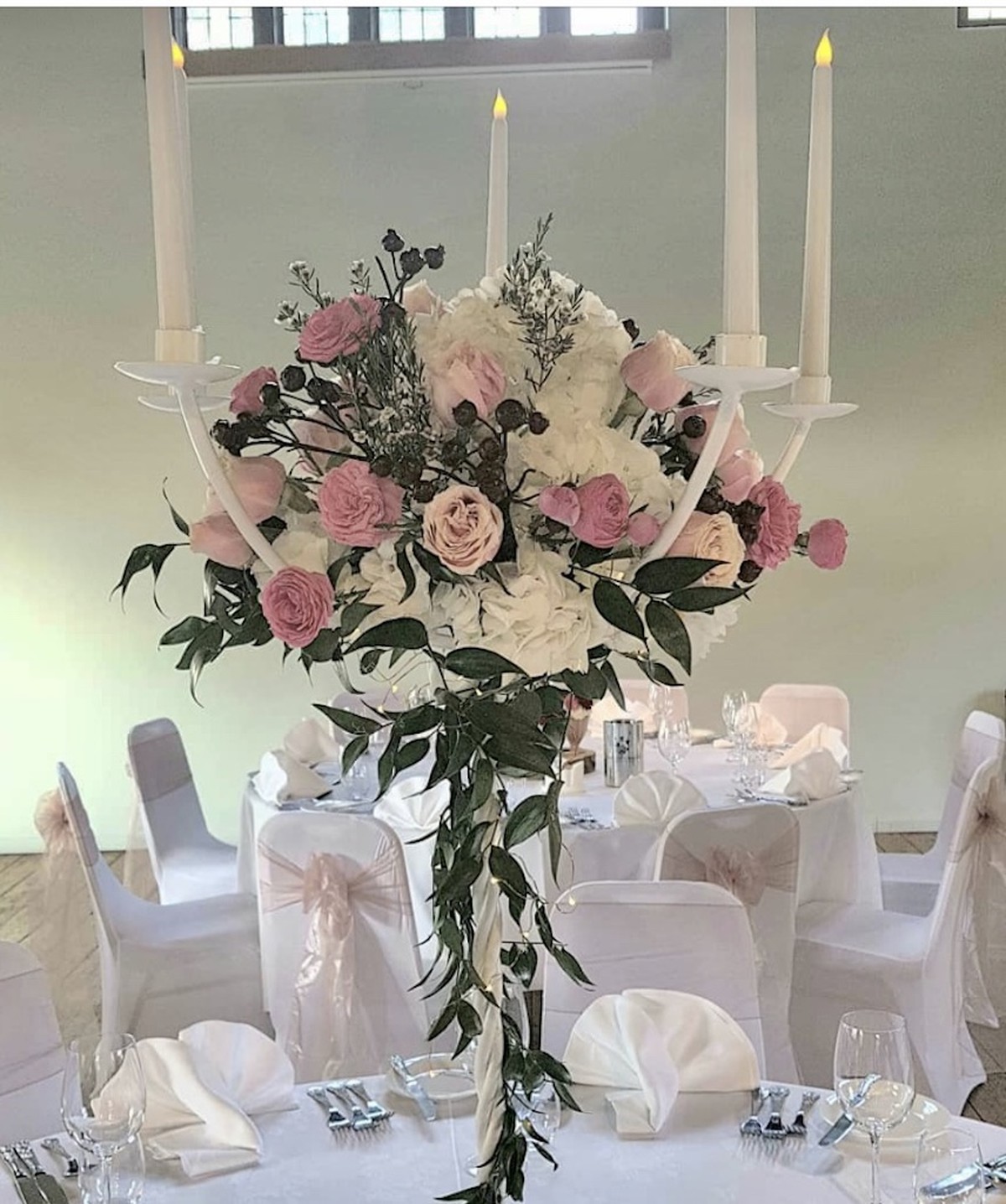 We have used these white powder coated tall metal candelabra over and over for weddings.They have a large round plate in the centre which enables you to use a large container to hold the foliage and flowers, can be used with or without oasis.